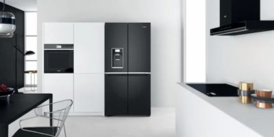 Het model is voorzien van lange, glanzende side-by-side deuren. Verder heeft het verzonken handgrepen en een klein display boven in de deur.